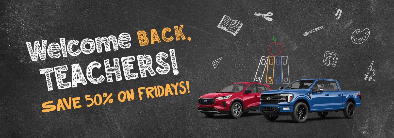 AMVIC Licensed Business. Offers available OAC and exclude GST. With valid proof of employment or ATA membership for elementary and secondary teachers only. Valid for oil change and tire installation appointments on Friday for a limited time only. Ford/Lincoln vehicles only. Valid until November 14, 2025. Offer subject to cancellation without notice. Some restrictions apply. See advisor for details.